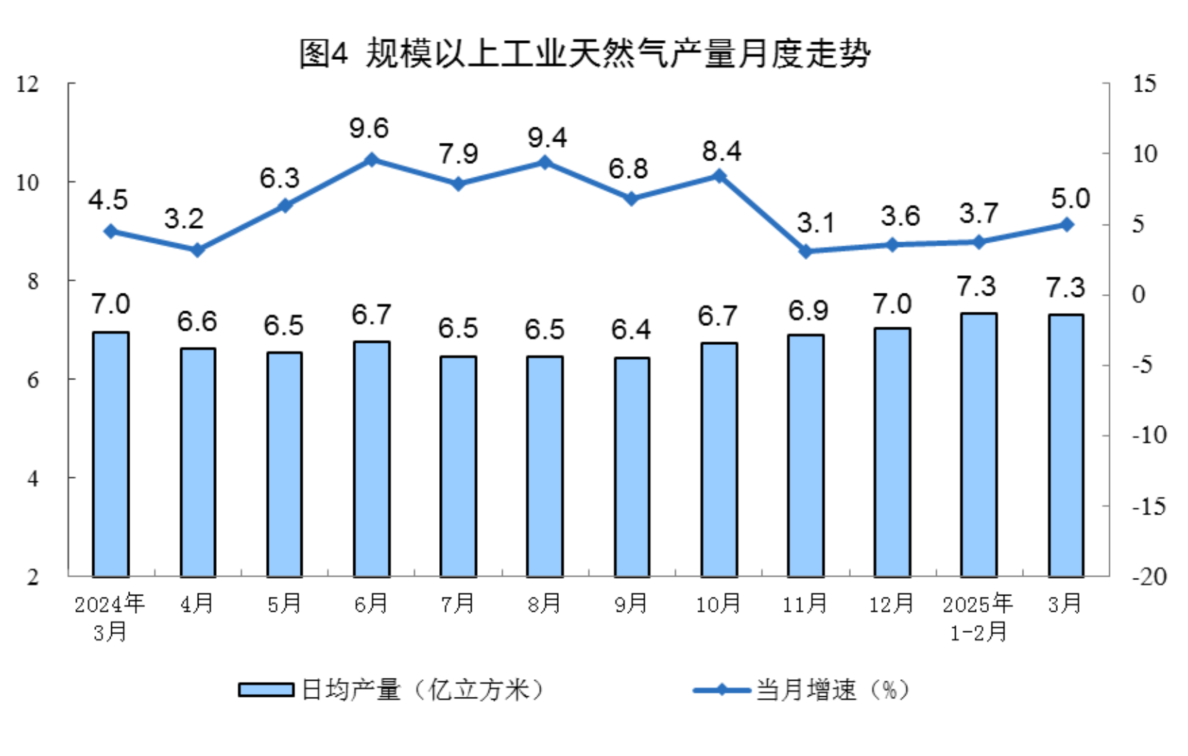 天然气生产稳定增长。3月份,规上工业天然气产量227亿立方米,同比增长5.0%,增速比1—2月份加快1.3个百分点;日均产量7.3亿立方米。