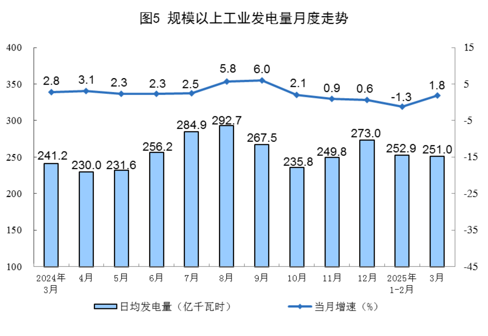规上工业电力生产增速加快。3月份,规上工业发电量7780亿千瓦时,同比增长1.8%,增速比1—2月份加快3.1个百分点;日均发电251.0亿千瓦时。1—3月份,规上工业发电量22699亿千瓦时,同比下降0.3%,扣除天数原因,日均发电量同比增长0.8%。