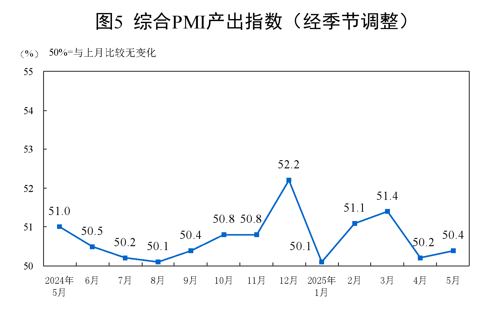 5月份,综合PMI产出指数为50.4%,比上月上升0.2个百分点,表明我国企业生产经营活动总体继续保持扩张。
