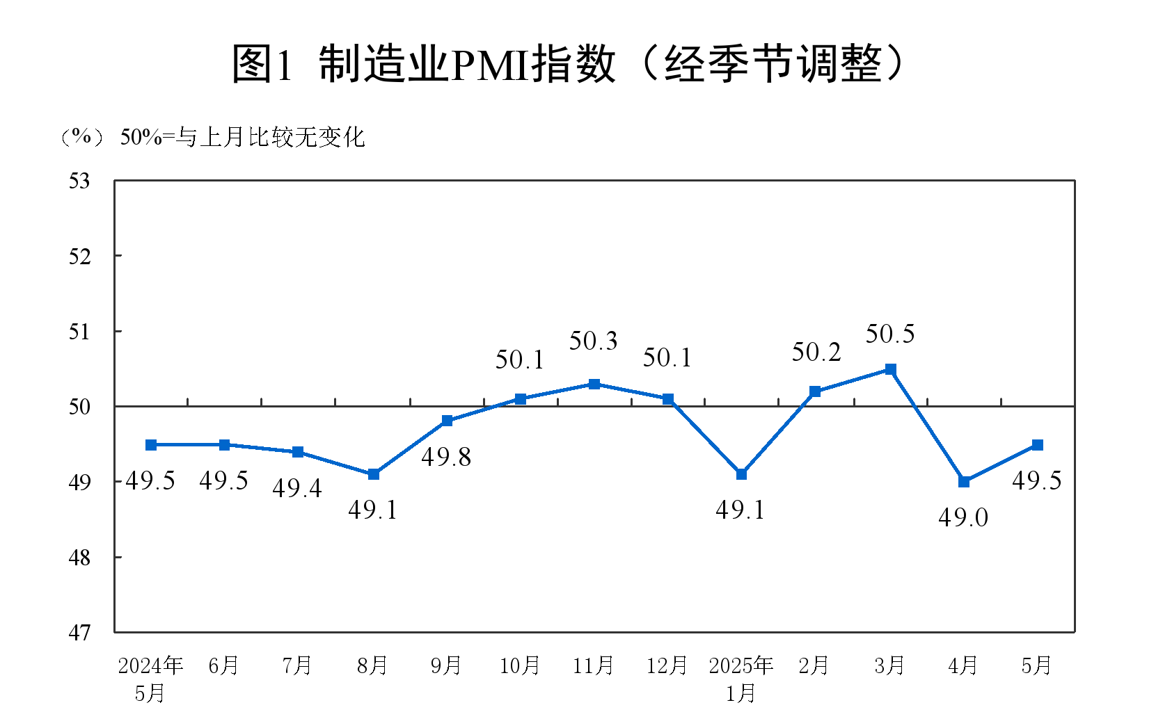 国家统计局31日发布制造业采购经理指数运行情况。5月份,制造业采购经理指数(PMI)为49.5%,比上月上升0.5个百分点,制造业景气水平改善。