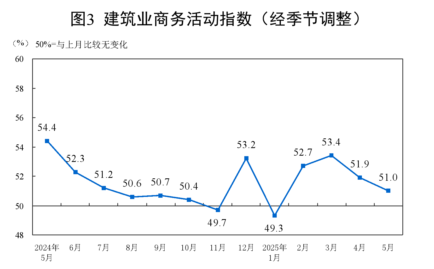 分行业看,建筑业商务活动指数为51.0%,比上月下降0.9个百分点;服务业商务活动指数为50.2%,比上月上升0.1个百分点。从行业看,铁路运输、航空运输、邮政、电信广播电视及卫星传输服务、互联网软件及信息技术服务等行业商务活动指数均位于55.0%以上较高景气区间;资本市场服务、房地产等行业商务活动指数均低于临界点。