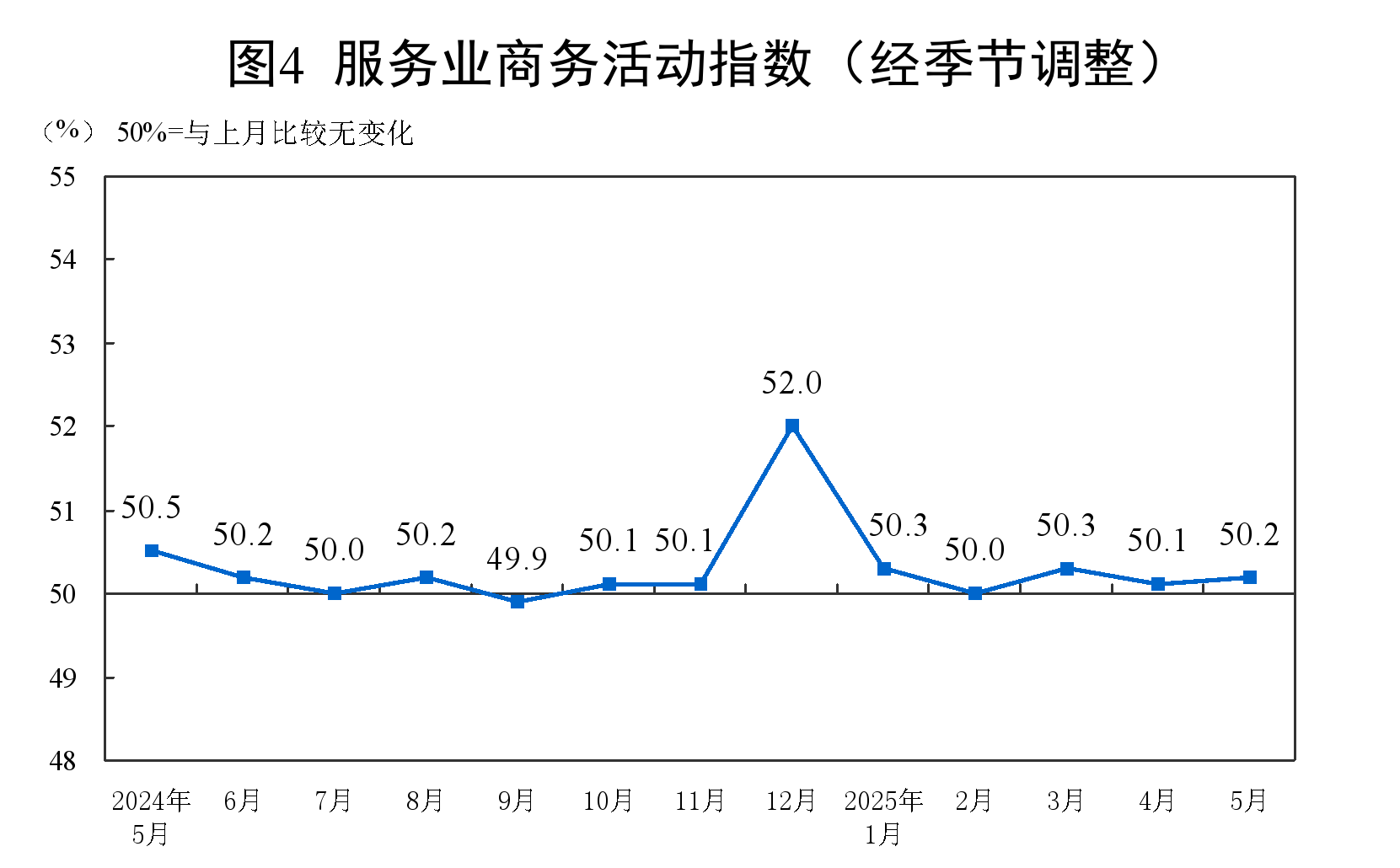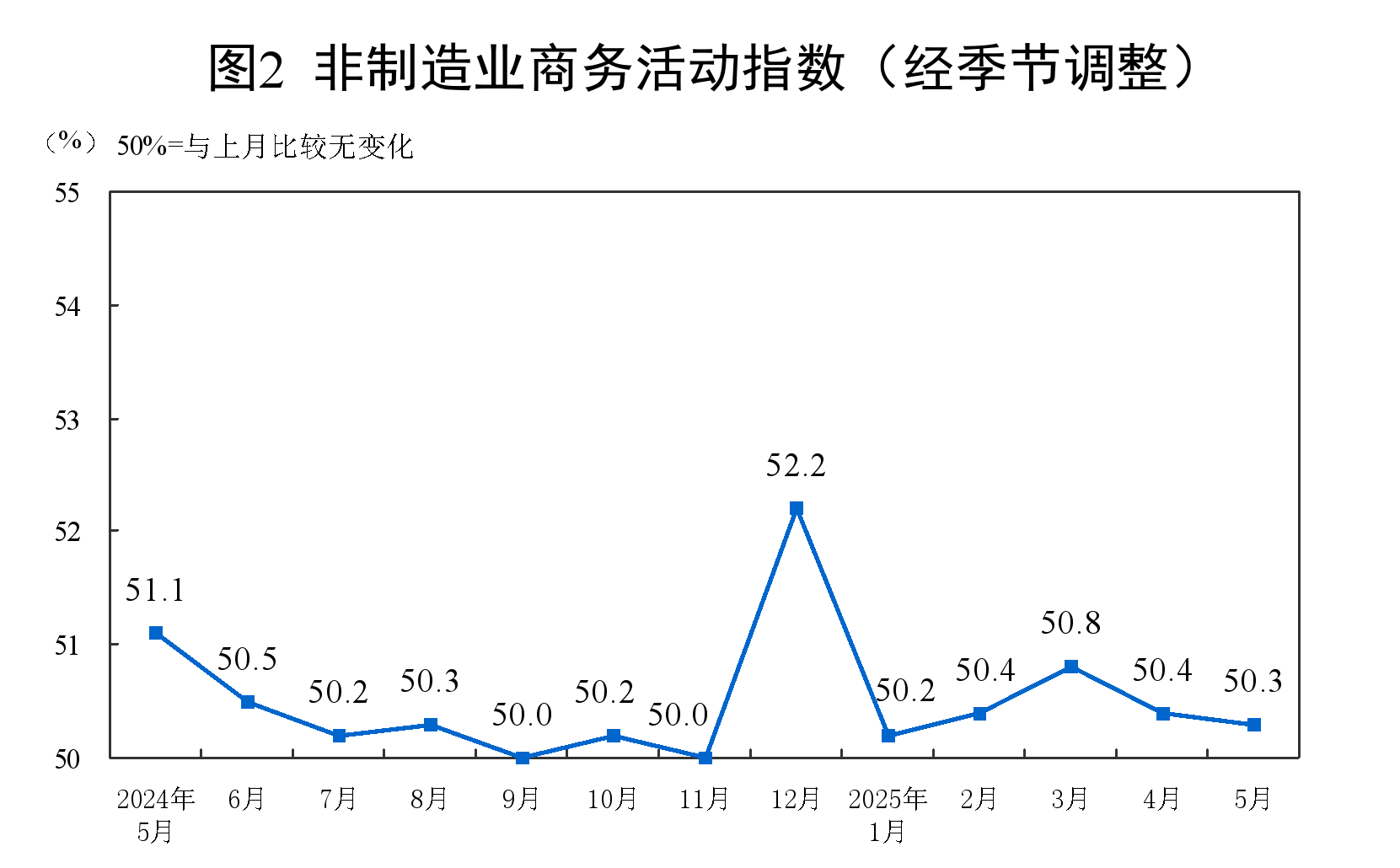 5月份,非制造业商务活动指数为50.3%,比上月下降0.1个百分点,仍高于临界点,非制造业总体延续扩张。