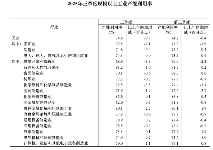 分主要行业看,2025年三季度,煤炭开采和洗选业产能利用率为68.9%,食品制造业为70.1%,纺织业为77.2%,化学原料和化学制品制造业为72.5%,非金属矿物制品业为62.0%,黑色金属冶炼和压延加工业为80.1%,有色金属冶炼和压延加工业为77.8%,通用设备制造业为78.9%,专用设备制造业为75.5%,汽车制造业为73.3%,电气机械和器材制造业为74.9%,计算机、通信和其他电子设备制造业为79.0%。