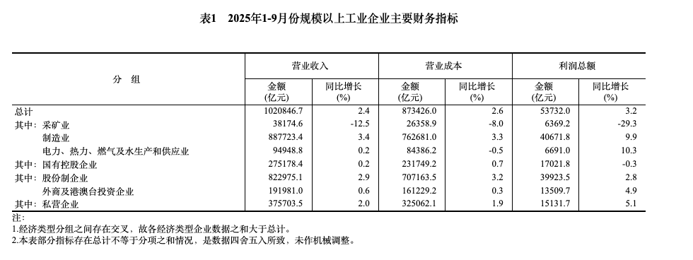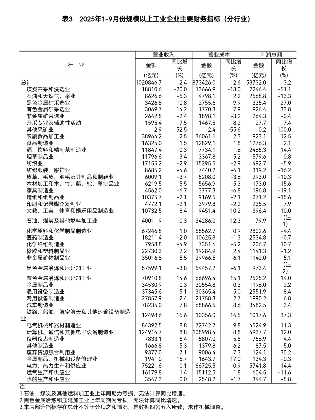 据国家统计局网站消息,1—9月份,全国规模以上工业企业实现利润总额53732.0亿元,同比增长3.2%(按可比口径计算,详见附注二)。