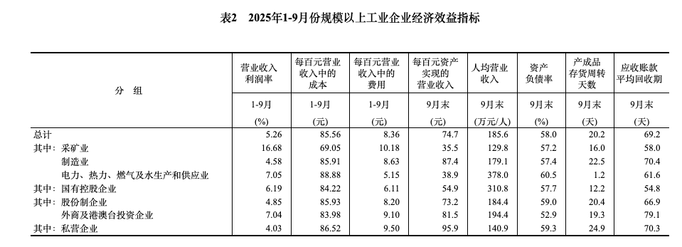 9月末,规模以上工业企业资产总计186.27万亿元,同比增长5.0%;负债合计107.96万亿元,增长5.2%;所有者权益合计78.31万亿元,增长4.7%;资产负债率为58.0%,同比上升0.1个百分点。