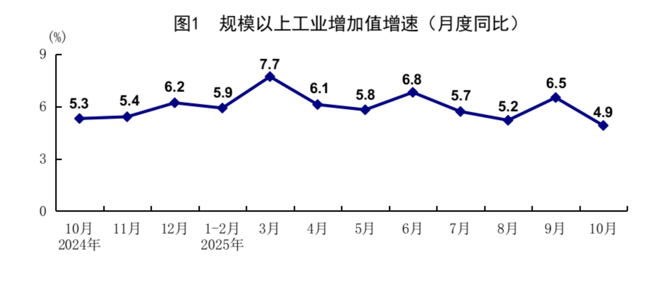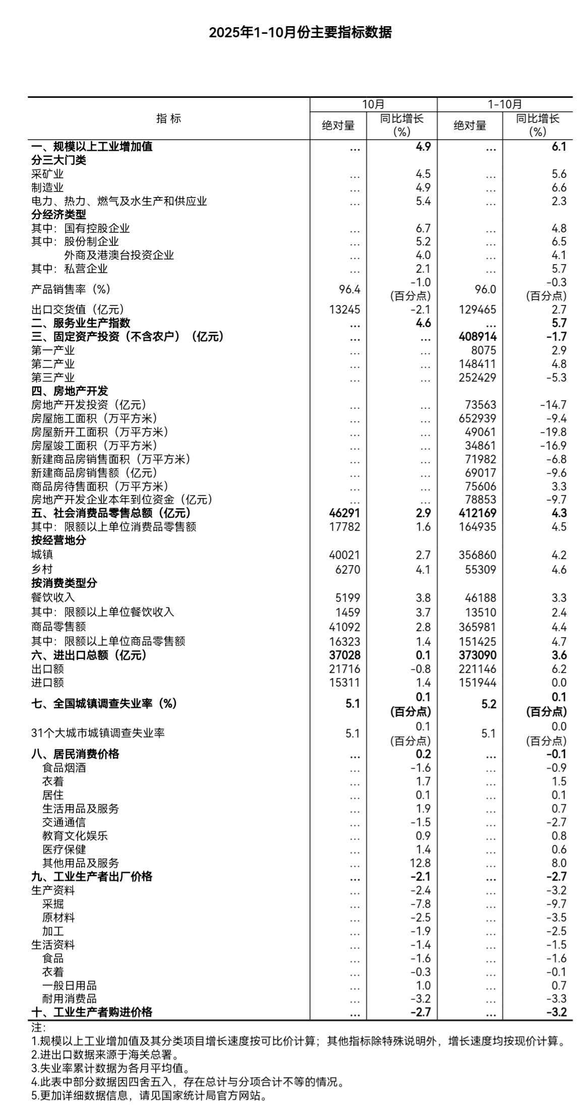 总的来看,10月份国民经济运行总体平稳,转型升级扎实推进,发展新动能继续壮大。也要看到,外部环境不稳定不确定因素较多,国内结构调整压力较大,经济平稳运行面临不少挑战。下阶段,要坚持以习近平新时代中国特色社会主义思想为指导,深入贯彻落实党的二十届四中全会精神,坚持稳中求进工作总基调,全方位扩大国内需求,着力稳就业、稳企业、稳市场、稳预期,积极推动宏观政策持续落地增效,全面深化改革开放,进一步强化创新驱动,促进经济质的有效提升和量的合理增长。