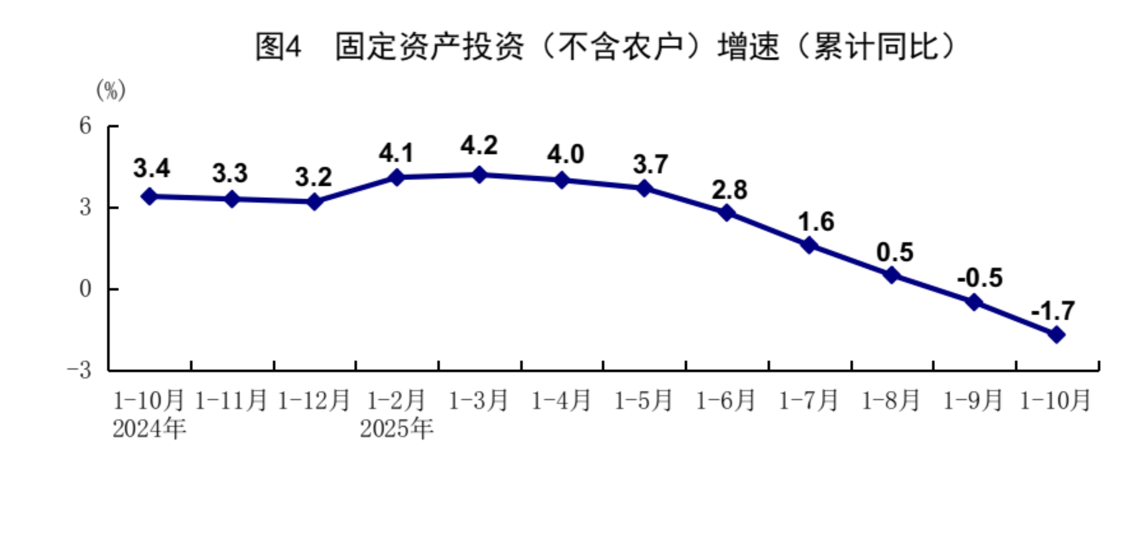 1-10月份,全国固定资产投资(不含农户)408914亿元,同比下降1.7%;扣除房地产开发投资,全国固定资产投资增长1.7%。分领域看,基础设施投资同比下降0.1%,制造业投资增长2.7%,房地产开发投资下降14.7%。全国新建商品房销售面积71982万平方米,同比下降6.8%;新建商品房销售额69017亿元,下降9.6%。分产业看,第一产业投资同比增长2.9%,第二产业投资增长4.8%,第三产业投资下降5.3%。民间投资同比下降4.5%;扣除房地产开发投资,民间投资增长0.2%。高技术产业中,信息服务业,航空、航天器及设备制造业,计算机及办公设备制造业投资同比分别增长32.7%、19.7%、4.1%。10月份,固定资产投资(不含农户)环比下降1.62%。