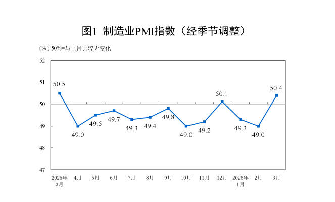 3月份,制造业采购经理指数(PMI)为50.4%,比上月上升1.4个百分点,高于临界点,制造业景气水平回升。