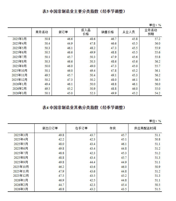 3月份,非制造业商务活动指数为50.1%,比上月上升0.6个百分点,高于临界点,非制造业景气水平有所改善。