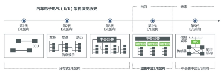 简单来说,传统的汽车E/E架构往往是采用以ECU(电子控制单元)为核心的分布式架构,即传感器、ECU和执行器一一对应,以保证各个系统的独立性和抗干扰性。智能网联、自动驾驶等技术给整车开发带来的巨大考验是爆炸式的数据处理需求和更高的运算速度。传统的分布式E/E架构,无论是运算能力和数据处理能力,还是车载网络传输效率等都无法满足自动驾驶和智能网联技术的要求。因此,汽车E/E架构开始由传统的分布式逐步转向以云计算为基础的中央集中式架构。下图是博世给出的汽车E/E架构演进路线图。