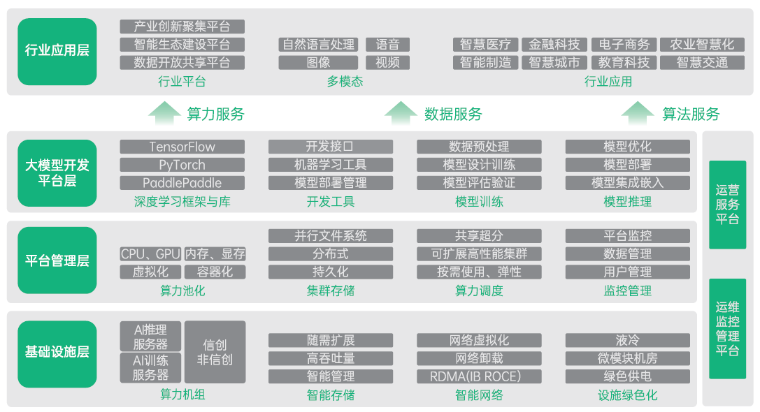 AIDC是一个融合了硬件、软件、网络、应用等多个层面的复杂系统。白皮书从基础设施层、平台管理层、大模型开发平台层及行业应用层进行了详细介绍。其中,基础设施层集成了AI训推服务器、智能存储等,提供核心算力和存储。平台管理层通过虚拟化等技术管理资源,构建弹性AI计算池。大模型开发平台层提供工具服务,助力模型构建优化。行业应用层则将AI技术转化为实际应用,推动产业升级和智能化。