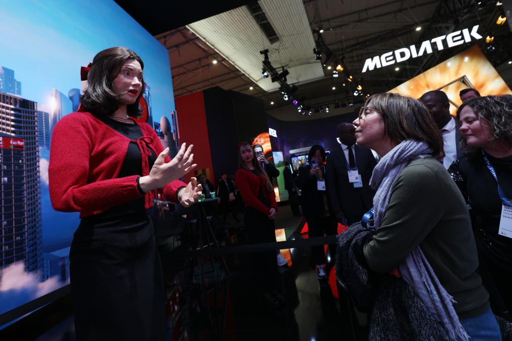 3月5日,人们在西班牙巴塞罗那举行的2025年世界移动通信大会上同机器人(左)互动。新华社记者赵丁喆摄