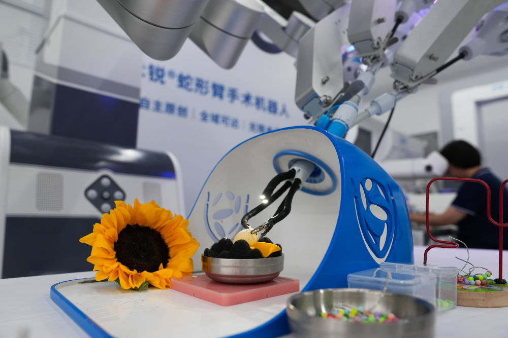 6月18日,工作人员在使用术锐蛇形臂手术机器人进行剥生鹌鹑蛋壳展示。新华社记者郑焕松摄