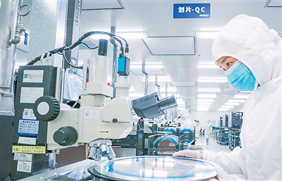 四川省遂宁经开区利普芯微电子无尘车间内,各条生产线上一片忙碌,工人们正加紧赶制订单。该企业生产的芯片畅销华南、华东、西南等多个地区,广泛应用于工业控制、汽车电子、新能源等关键领域,为相关产业发展注入强劲动力。图为工人正在检测芯片。刘昌松摄(人民图片)