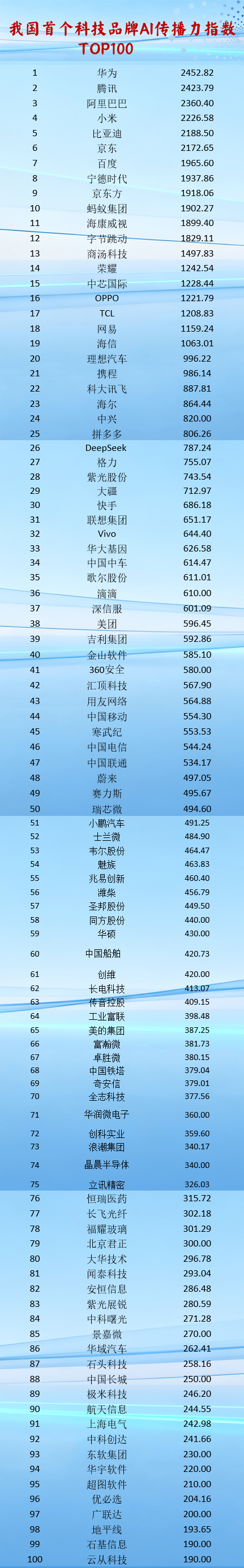 其次,在上榜的科技品牌中,华为高居榜首,虽和荣耀拆分,但两个品牌均在榜单前列。同时,前12名的指数分值均很接近。上榜公司成立时间跨度大,有老牌企业,有新兴公司,说明历史数据量和历史新闻量在AI时代并不代表传播力。