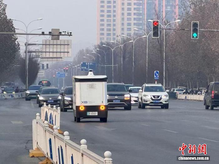 2025年12月17日,廊坊市街道上行驶的无人配送车。赵丹媚摄