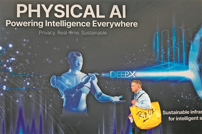 从制造业到医疗,从交通到家庭服务,物理AI正以前所未有的深度融入并赋能各行各业。图为一名男子在2026年美国拉斯维加斯消费电子展上走过印有物理AI字样的展台。