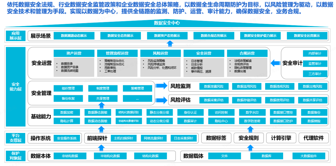 在数据安全方面,依托数据安全法规、行业数据安全监管政策和企业数据安全总体策略,以数据全生命周期防护为目标,以风险管理为驱动,以数据安全技术和管理为手段,实现以数据为中心,提供全链路的监测、防护、运营、审计能力,确保数据安全、业务合规。