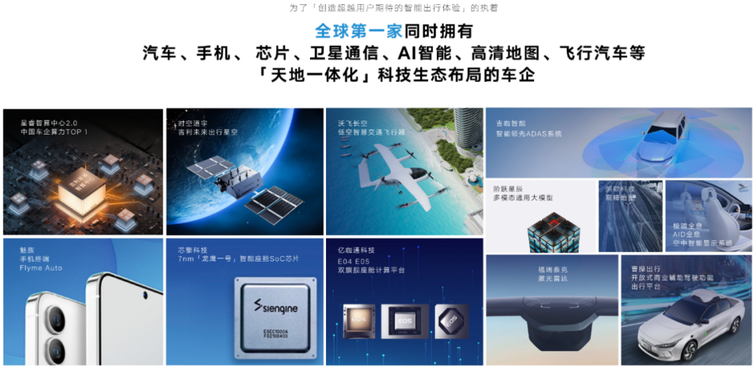 吉利汽车集团始终以用户为中心,以技术创新领跑,坚持高质量发展,充分发挥吉利控股集团体系化协同战略优势,在整车架构、汽车安全、新能源三电、智能座舱、高阶智能驾驶、智算中心、AI大模型、AI数字底盘等核心技术领域实现全栈自研,为用户创造超越期待的智能出行产品和体验。
