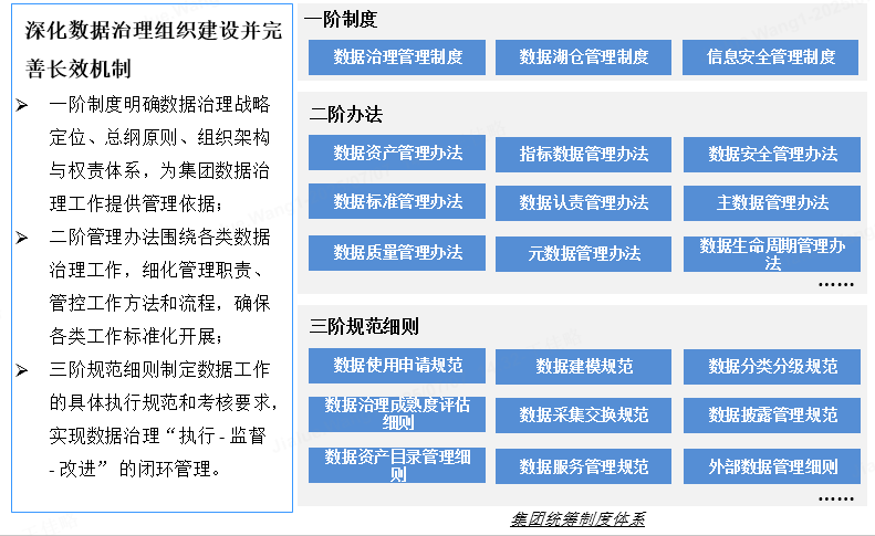 在制度流程体系构建层面,集团锚定数据治理现代化目标,建立健全制度框架:围绕数据资产管理、指标规范统一、质量标准管控、安全合规保障等核心领域,制定并实施30余项管理制度与实施细则,推动数据要素实现规范化、高效化、价值化发展。
