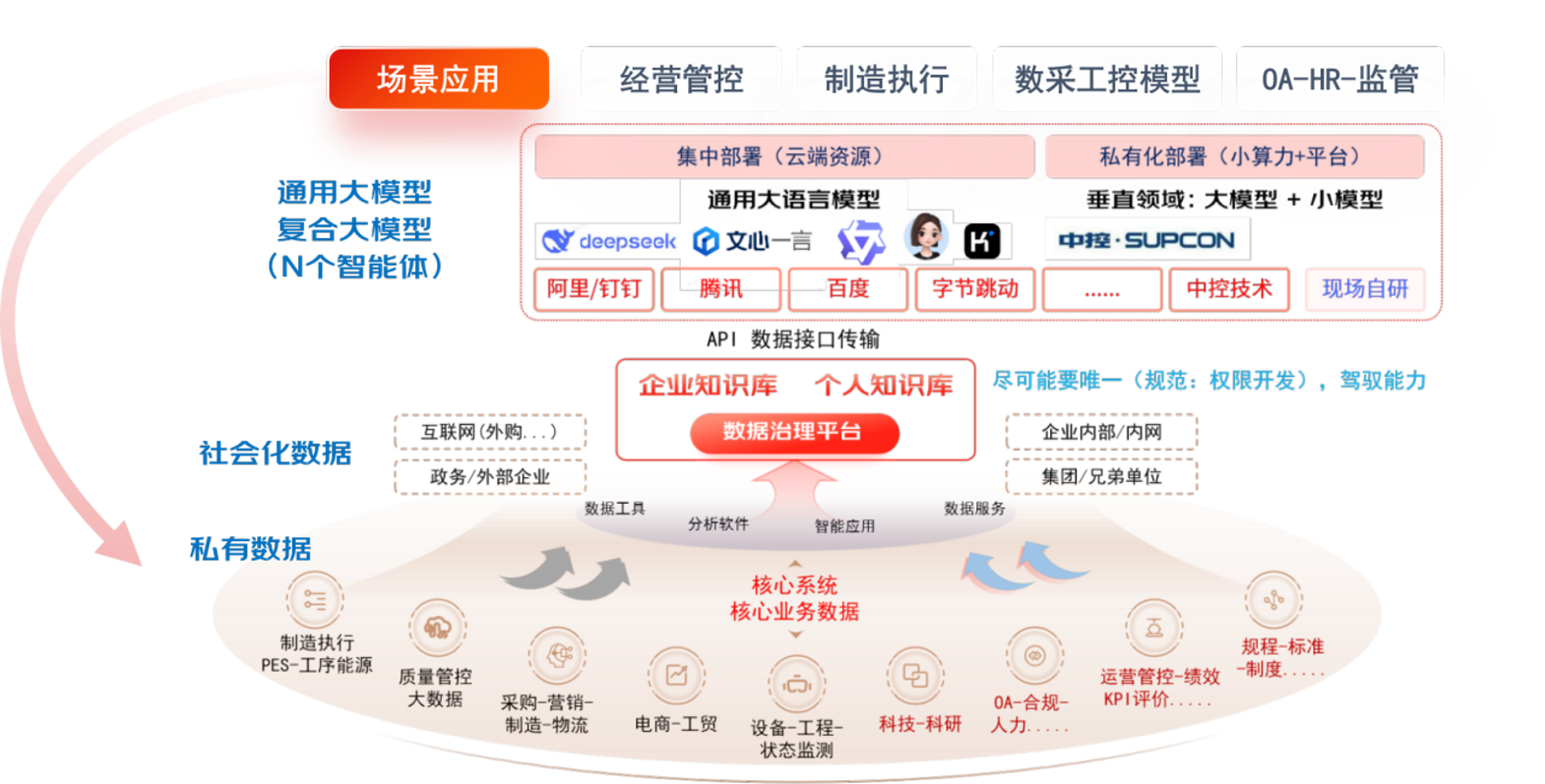 在技术架构上,创新构建“私有数据平台+公有云AI平台”双平台集成架构,既调用公有云的AI资源优势,又保障企业核心数据安全,实现异构信息系统的无缝衔接。同时借鉴大型央企“双重ERP系统”架构经验,在集团层面部署侧重合规监管与资金管控的集中式ERP,在基层实体部署侧重精益生产的业务运营ERP,通过统一数据中台实现深度对接,为穿透式管理提供刚性技术支撑。