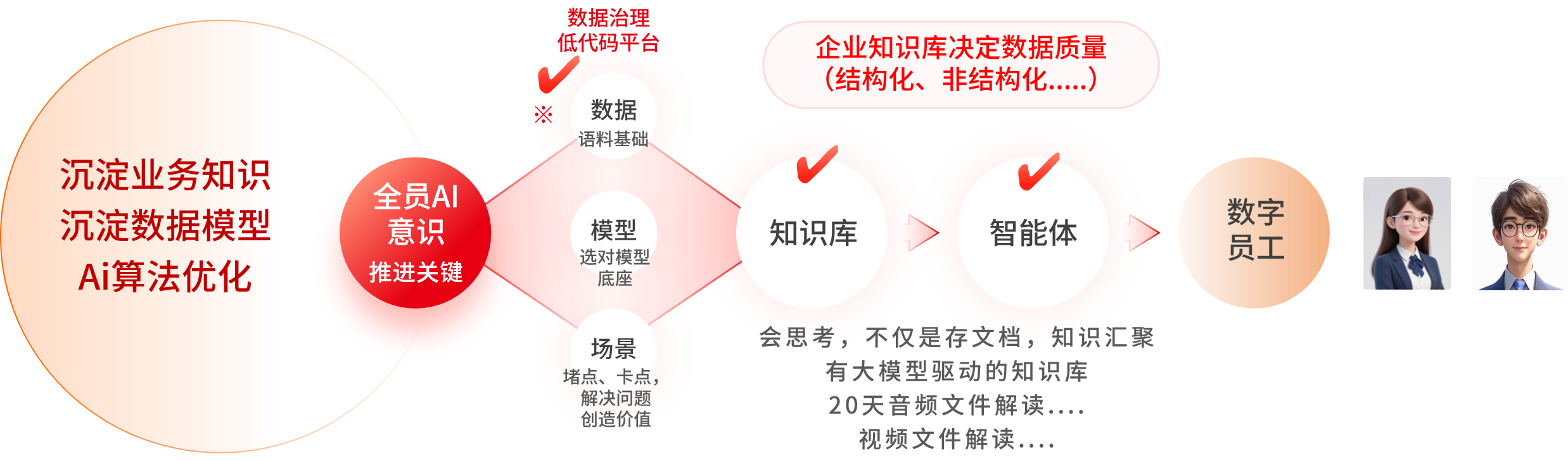 AI落地的前提是解决“人、数据、知识”三大核心问题,全员AI意识转变,是数据应用落地的前提,只有转变了传统的思维、主动接纳,才能让技术真正发挥作用;数据资产的积累,依托前期建立的大数据平台,打通了不同年代、不同技术路线的业务系统,整合了数据应用的基础能力,为AI提供坚实的数据底座和语料;多层级知识库构建,搭建个人、部门、企业级私有化知识库,为智能体、数字员员工的落地提供了支撑,实现AI应用“根基牢固”。