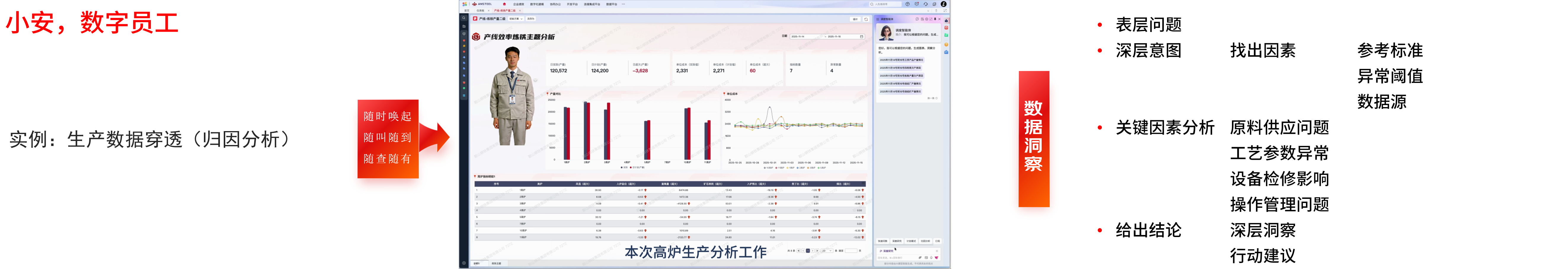 鞍山钢铁是鞍钢集团的重要子企业,作为钢铁领域核心央企成员,立足传统制造企业数字化转型痛点,形成了以“业务为核⼼、数据为基础、场景为落脚点”的业务转型思路,坚持以“业务出题、技术答题、数据阅卷”为工作模式,聚焦“降本、增效、提质、控险”四大核心目标,推动AI技术从概念走向实效,筑牢实体产业数字化转型的“压舱石”。