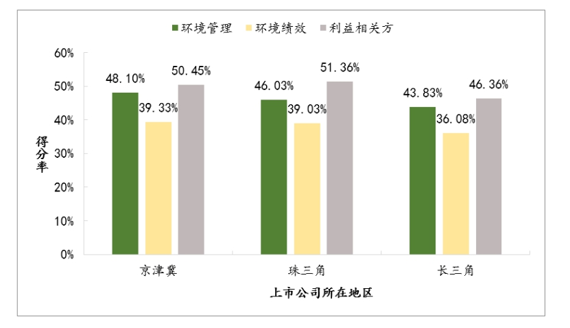珠三角地区企业环境责任信息披露指数平均分为42.59,京津冀地区为42.24,长三角地区为36.61(总平均分为39.89)。从一级指标得分率来看,三地区得分率相近;其中京津冀地区企业环境管理、环境绩效两个一级指标得分率最高,分别为48.10%、39.33%;珠三角地区企业的利益相关方指标得分率最高,为51.36%。