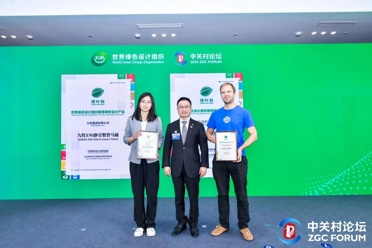 现场为两款绿色设计产品授予绿叶标证书,分别来自九牧集团X90静音数智马桶以及来自英国的SA600空气净化器,邀请联合国和平大使、世界绿色设计组织副主席李英喆先生为他们授予“绿叶标”证书