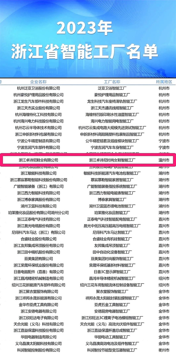 近日,浙江卓诗尼鞋业有限公司(以下简称“卓诗尼”)斩获“浙江省智能工厂”荣誉称号。