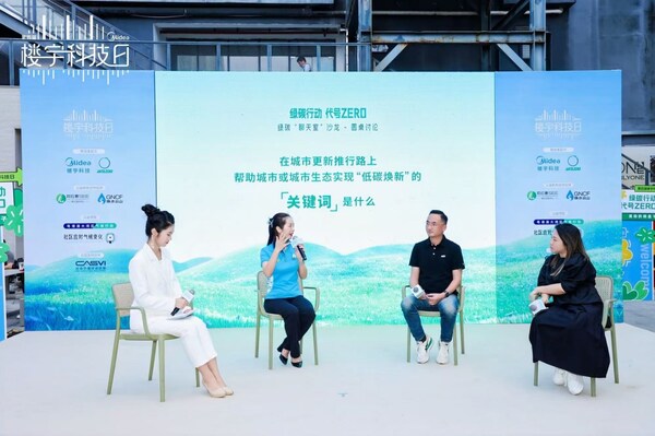 在长满"花"的烟囱下方,多位重磅嘉宾在美的楼宇科技特邀下参与绿碳"聊天室"沙龙,共聚畅聊减碳新模式。