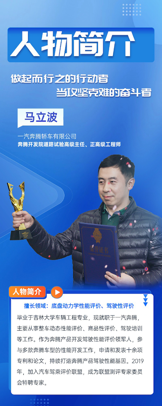 奔腾一直很重视车辆的动态驾驶性能,也建立了完整的车辆主客观评价体系。在主观评价方面,除了一些专业属性的方案评价之外,还建立了用户使用场景评价方法,从实际的场景出发,对车辆性能进行综合评价。这二十年来,马立波一直负责车型开发及验收工作,包括工程目标设定、研发过程的标定调校、三高评价以及最终验收评价等,编制和发布多个流程及标准,编写多项评价规范及文件。近几年累计评价车辆200余车次,评价环境覆盖标态、高原、高温、高寒等地区,反馈和解决问题300余项。为了持续提升用户体验,他提出将驾驶性主观评价加入场景化和多层级评价的方式。除了常规的评价项目之外,加入市区、市郊评价场景,以及开展用户工况小长测,从用户使用场景和角度进行多维评价;制定技术人员+领导层多层级评价机制,分别从专业层级、开发院层级、公司层级进行评价验证。目前奔腾新车型在起步、动力感、加速响应等方面都发挥了优良的性能。奔腾新开发车型经过专业层和管理层多级实车评价,驾驶性表现优异,得到一致好评,形成了“劲、稳、顺、悦”的性能基因。