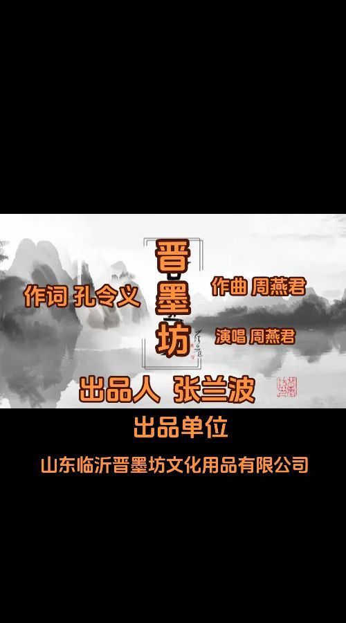 《晋墨坊》——山东临沂晋墨坊文化用品有限公司出品作词 孔令义作曲 周燕君演唱 周燕君配器 林 虎录音 段小舟缩混 胡 轩乐队统筹 李 朋演奏 国际首席爱乐乐团出品人 张兰波蒙山松烟超千年书圣爱墨古法传书法绘画不渗染代代名家都喜欢云中燕墨 密方炼厂家来自沂河边新时代 新科技近百品种系列全晋墨坊 云中燕老字号 美名传用墨选用云中燕非遗品牌任挑选中国非遗文化传承,一曲诗韵《晋墨坊》点点墨墨韵春秋。