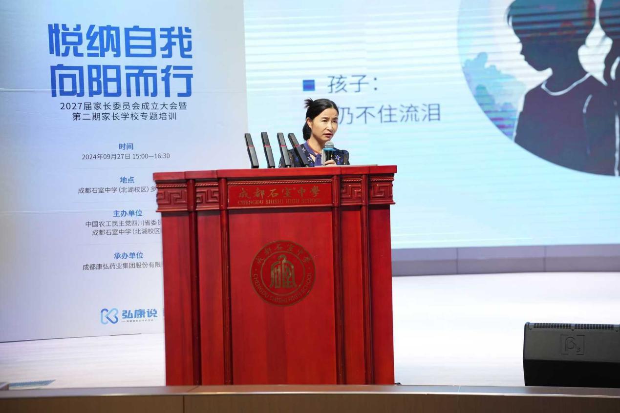 9月27日下午,“弘康说——悦纳自我·向阳而行”青少年心理健康公益科普家长专场活动在成都石室中学(北湖校区)成功举行。本次活动由中国农工民主党四川省委员会、与成都石室中学(北湖校区)联合主办,成都康弘药业集团股份有限公司承办,邀请四川省医学科学院、四川省人民医院·四川省精神医学中心副主任兼睡眠医学中心主任李静教授,向现场700余位中学生家长们详细讲解了青少年抑郁的识别、诊断及治疗策略,并分享了帮助孩子保持心理健康的方法与技巧。