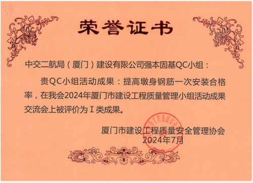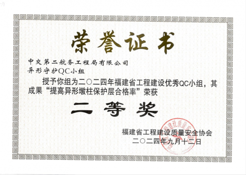 近日,福建省工程建设质量安全协会公布“2024年第四十次福建省工程建设优秀质量管理小组活动成果”获奖名单,中交第二航务工程局有限公司“异形守护QC小组”、质效提升及U.P.S.CQC等8项QC成果分别获得二等奖及三等奖,同时获得莆田、厦门、泉州、龙岩等地市级“2024年优秀质量管理小组活动成果”18项,其中一等奖3项、二等奖4项、三等奖11项,为打造福建省建设工程省级优质工程奠定了坚实基础。