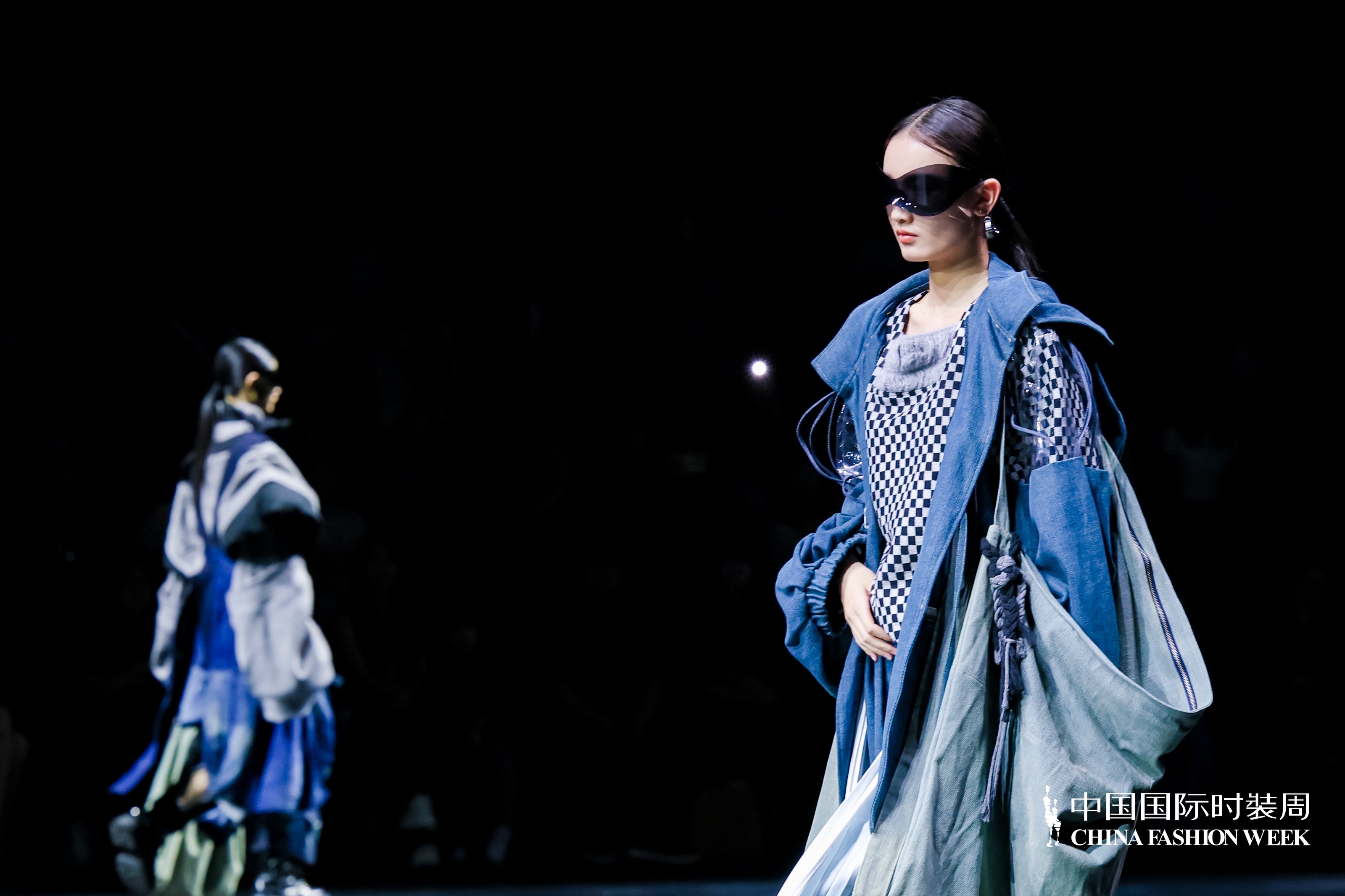 19组来自全国各地(含港澳地区)的青年设计师依次登场,以多元视角诠释大赛主题。运用天然染料编织幻彩纹理,与针织面料形成巧妙的碰撞,讲述宇宙星河中连接现实与未来的载体,或是融合茶染、热转印、植物拓印等工艺,展现新世代设计师对传统文化的思考,又或是以复古磁带为灵感来源,将声波轨迹化作立体绗缝,展现一衣多穿的创新思路……作品体现了青年设计师的先锋性和实验性,展现出Z世代设计师对人、社会与自然的敏锐观察和自主创新的开发能力,以及在剪裁工艺上的专业沉淀。为延续赛事高潮,世界街舞冠军肖杰领衔少年舞团登场,一段热舞吸引机器人前来“Battle”,人与机器竞舞的诙谐画面瞬间点燃舞台。