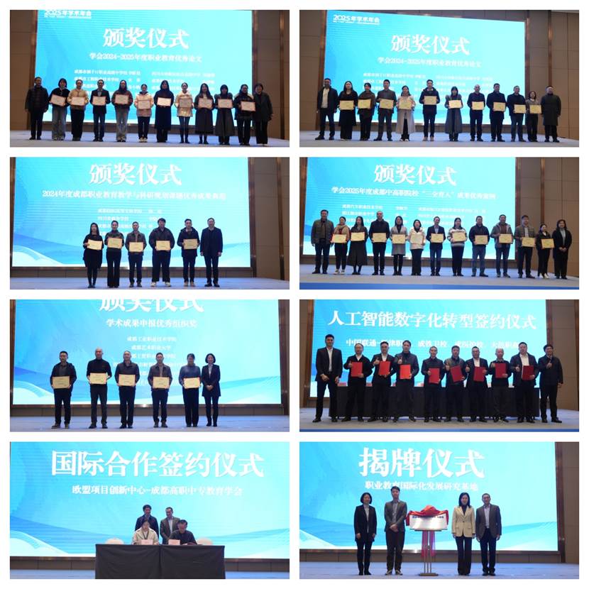 开幕式现场的颁奖、签约与揭牌三项仪式,亮点纷呈、意义深远,成为职教赋能教育强国建设的重要实践载体。为树立职教发展标杆、激励同仁深耕教研,大会对学会2024—2025年度职业教育优秀论文、学会2025年度成都中高职院校办学成果优秀案例、学会职业教育教学与科研规划课题优秀成果典范、学会“三全育人”优秀成果案例,以及学术成果申报优秀组织奖等多项先进集体与个人予以表彰。