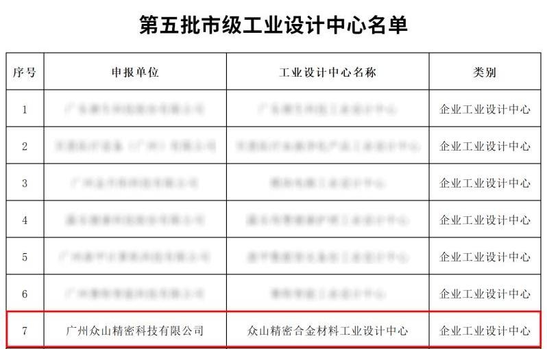 8月23日,广州市工业和信息化局发布《关于公布第五批市级工业设计中心认定名单的通知》,众山精密合金材料工业设计中心获得认定
