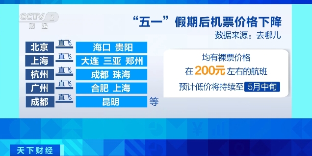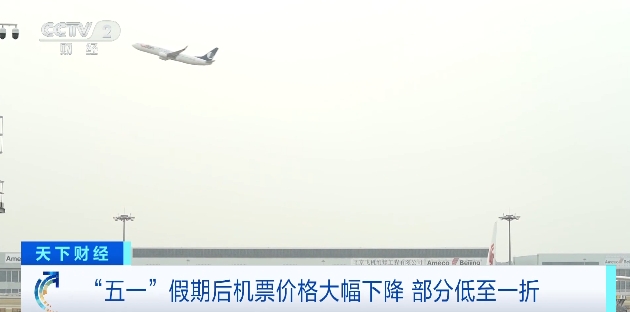 (央视财经《天下财经》)“五一”假期过后,多条热门航线的机票价格大幅下降,其中部分低至一折左右。