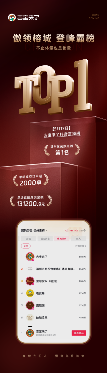 仅6个小时,吉宝来了直播间总成交订单突破2000笔,单日成交GMV突破13W元!累计曝光5W+次,商品转化率达到35.25%,斩获同城休闲娱乐榜TOP1!