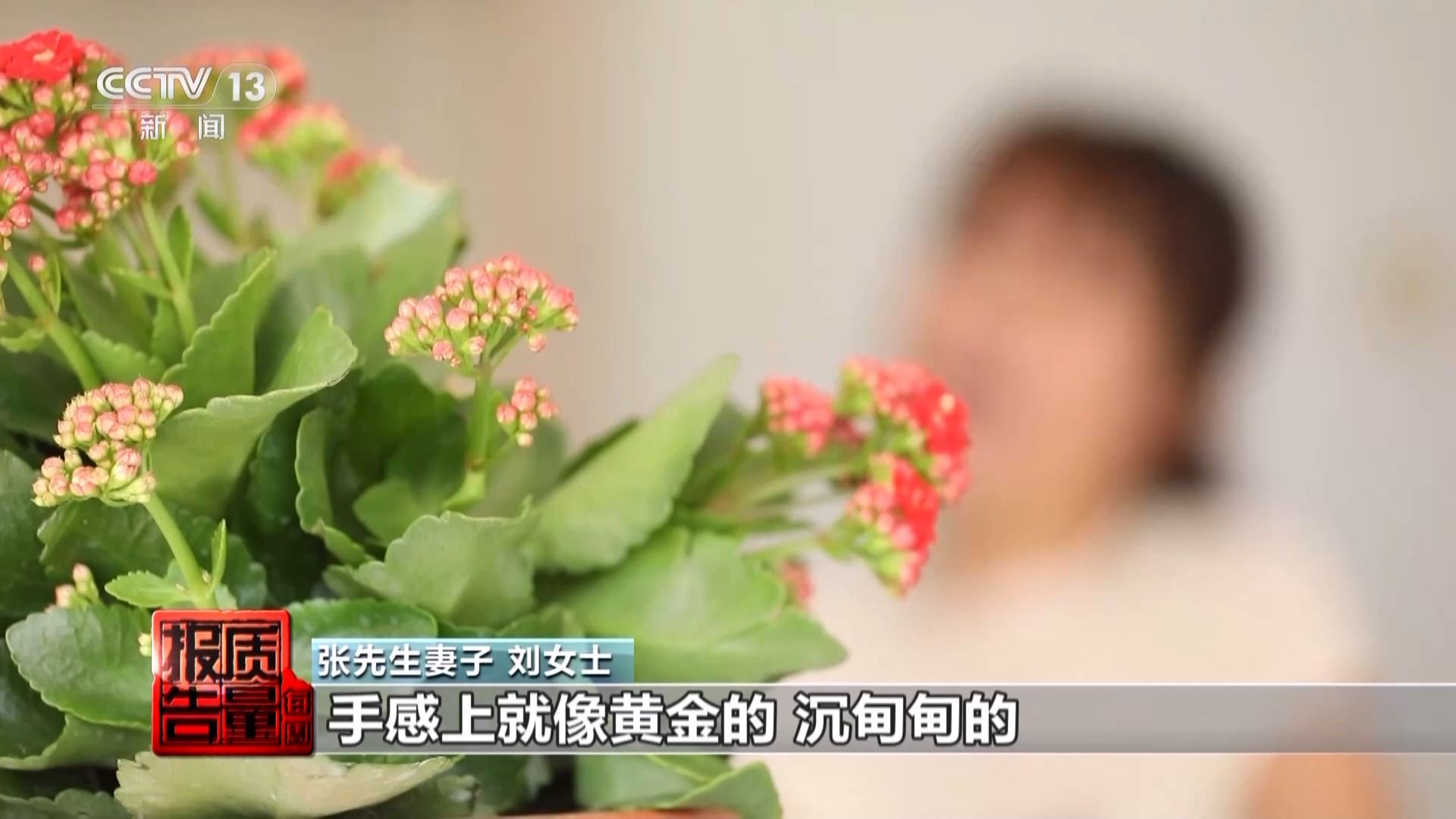 张先生妻子 刘女士:我一看特高兴,从外观上、色泽上、手感上就像黄金,沉甸甸的。我问多少钱,他告诉我499块9,我说可能吗,我说黄金500多块钱一克,他说你放心,说这就3到5单,抢的,而且假一赔十,确保999足金,这我才相信。