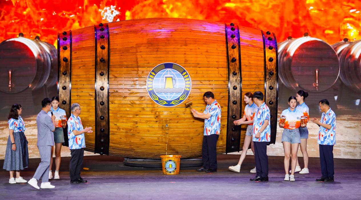 在万众期待的第一桶啤酒开启环节,伴随着灯光闪烁,LED大屏幕徐徐打开,一个由数字光影技术打造的巨大啤酒桶出现在舞台中央,虚拟酒桶逐渐化身为一个真实的啤酒桶,闪耀全场。随后,青岛市委副书记、市长赵豪志与优秀企业家代表、劳模代表和基层工作榜样代表等中外嘉宾共同开启第34届青岛国际啤酒节第一桶啤酒,并举杯向四海宾朋发出诚挚邀请。当歌曲《举杯吧朋友》唱响全场时,璀璨的焰火在夜空中升腾绽放,现场氛围达到了高潮,充分彰显了“青岛与世界干杯”的热情好客和豪迈气度。