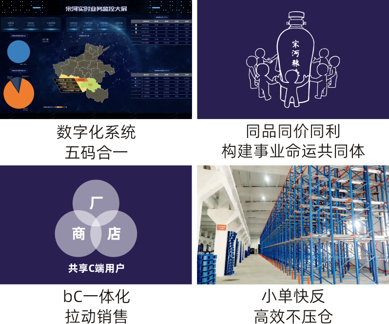 以宋河酒仓为依托,新宋河经营环节“从一瓶酒到一个人”实现全链路数字化,通过三网合一、bC一体化拉销和私域运营,做好包括场景、私域和货架在内的六双基建,实现了从厂家到消费者的渠道关系重构,通过刺激C端倒着激活b端网点。