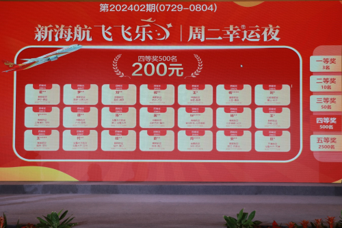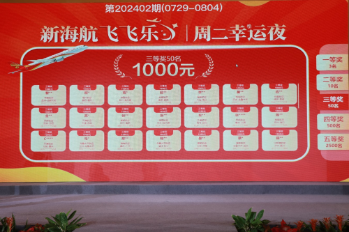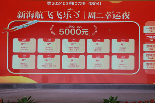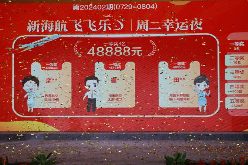 “飞飞乐”周二幸运夜现金抽奖活动是新海航近期推出的一项旅客回馈活动,活动时间为期5个月,从2024年7月30日起持续至2024年年底,其间每周二20:00都会举行一场现金抽奖活动,每期奖金总额超过47万元,一等奖3人,每人可获得48888元现金,此外还有5000元、1000元、200元、50元大小奖项共计3000余个中奖名额。活动期间,凡凭中国大陆有效身份证件(包括居民身份证、中国护照、港澳通行证、台湾通行证或其他有效证件)实际乘坐海航航空集团旗下11家指定航司任一航班的旅客,就可以自动获得下一个自然周周二对应一期现金抽奖的参与资格。11家指定航司具体包括海南航空、大新华航空、首都航空、天津航空、祥鹏航空、西部航空、北部湾航空、乌鲁木齐航空、福州航空、长安航空和金鹏航空。每期直播抽奖都会在公证人员的现场监督下进行,并通过“海南航空”APP等线上平台同步进行直播。
