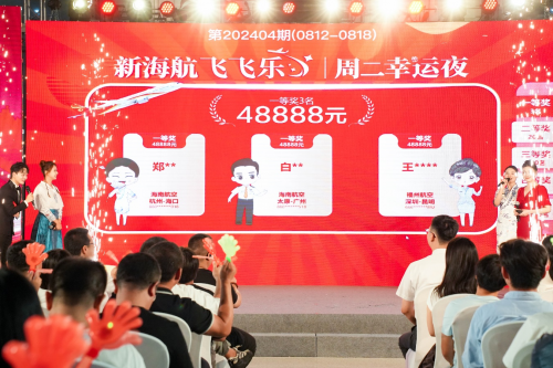 “飞飞乐”周二幸运夜现金抽奖活动是新海航今年重磅推出的一项旅客回馈活动,自7月30日起持续至2024年年底,其间每周二20:00开展一场现金抽奖活动。活动期间,凭中国大陆有效身份证件(包括居民身份证、中国护照、港澳通行证、台湾通行证或其他有效证件)实际乘坐海航航空集团旗下11家指定航司任一航班的旅客,即可自动获得下一个自然周周二的现金抽奖参与资格。11家指定航司包括海南航空、首都航空、天津航空、祥鹏航空、西部航空、北部湾航空、福州航空、乌鲁木齐航空、长安航空、金鹏航空和大新华航空。每期直播抽奖均在公证人员的现场监督下进行,并通过“海南航空”APP和其他官方合作平台同步直播。