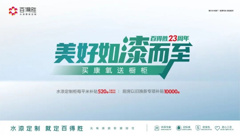 2024年,百得胜水漆整家定制迎来23周年庆,针对当前市场上旧改、局改到全面翻新装修的多元化需求,品牌以差异化新风康氧为抓手,以康氧送橱柜为具体活动措施,切入厨房旧改市场,隆重推出“美好如漆而至”主题活动,旨在为消费者带来实实在在的福利。