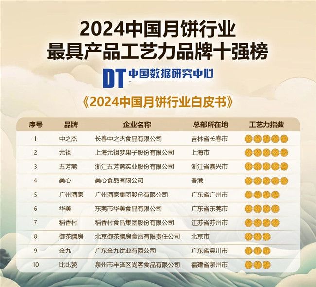 此番荣耀登榜的包括中之杰、元祖、五芳斋、美心、广州酒家、华美、稻香村、御茶膳房、金九、比比赞这十大享誉业界的月饼品牌。