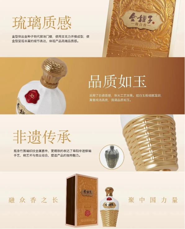 价值五:高装质感。金种子馥30瓶体采用了白瓷质感,珠光工艺效果,如白玉般细腻温润,寓意纯洁高贵,品质如玉。器型创意结合阜阳传统非遗柳编技艺,极具文化特色。