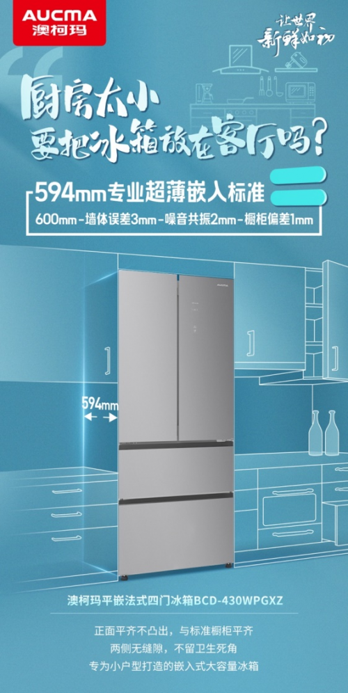厨房是家庭生活的核心区域,其空间合理利用一直备受关注。近日,澳柯玛即将推出的全新BCD-430WPGXZ法式平嵌冰箱,它以700mm的超窄箱体宽度,594mm的超薄机身,将空间美学与实用价值完美结合,赋予小型厨房无限可能。