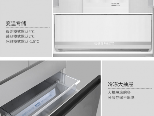 更重要的是,为满足人们日益丰富的存货品类,这款冰箱在拥有大容积的同时,内部分区也大有乾坤,能够实现三档变温,针对婴儿辅食、干货臻品或者生鲜肉类,分别对应4℃、2℃及-1.5℃三种模式,让每一种食材都能在适应的温度下得到妥善存储,真正实现一台冰箱全家安心。